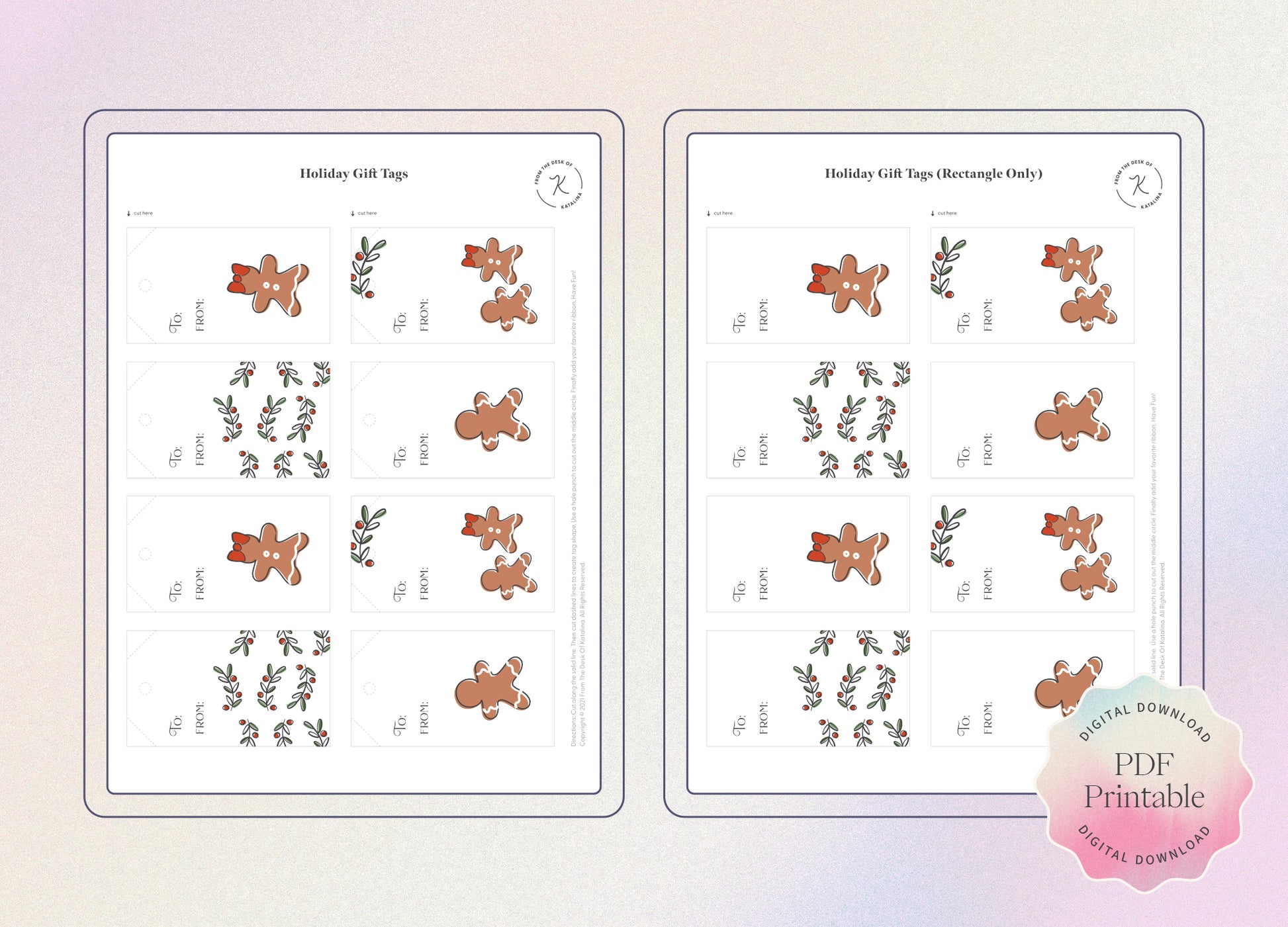 Tis' the season for giving and we've got the perfect printable to help with all your wrapping. Our Holly & Spice Holiday Gift Tags will add a sweet touch to your presents! They feature Katalina's 2021 holiday illustrations of holly berries and gingerbread people. How cute?! Simply print, cut, and fasten with your favorite ribbon! Happy gifting!